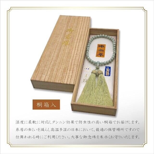 ・ 防虫、防湿効果を持ち、大切な御念珠を保管するに相応しい桐箱(日本製)へ納めてお届けします。外箱サイズ 幅93mm×奥行256mm×高さ29mm